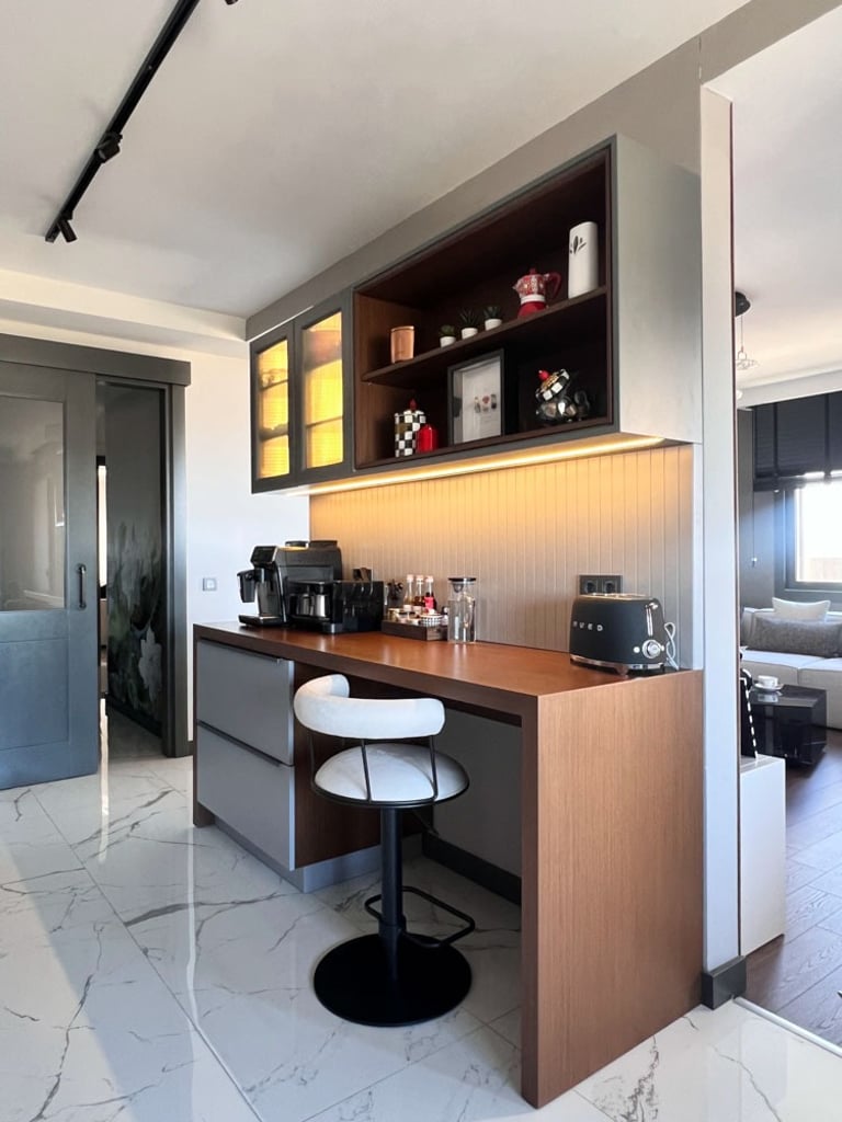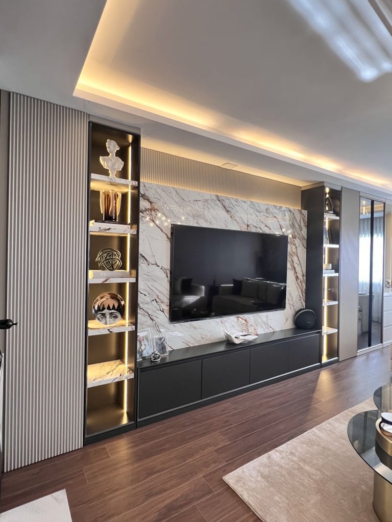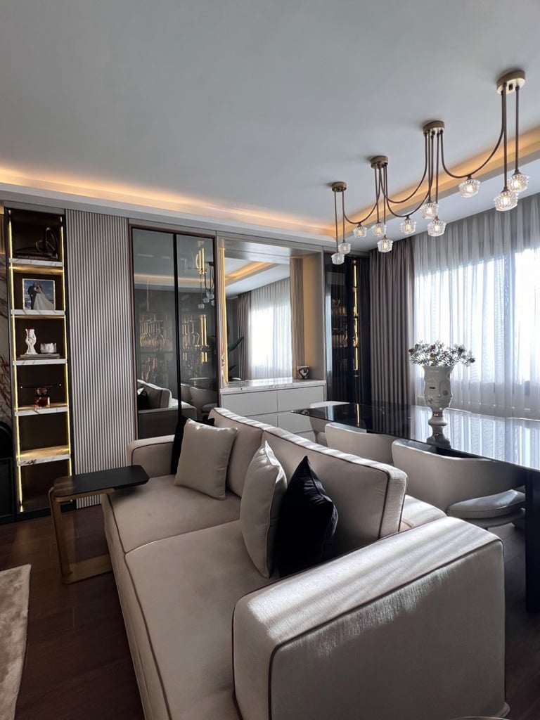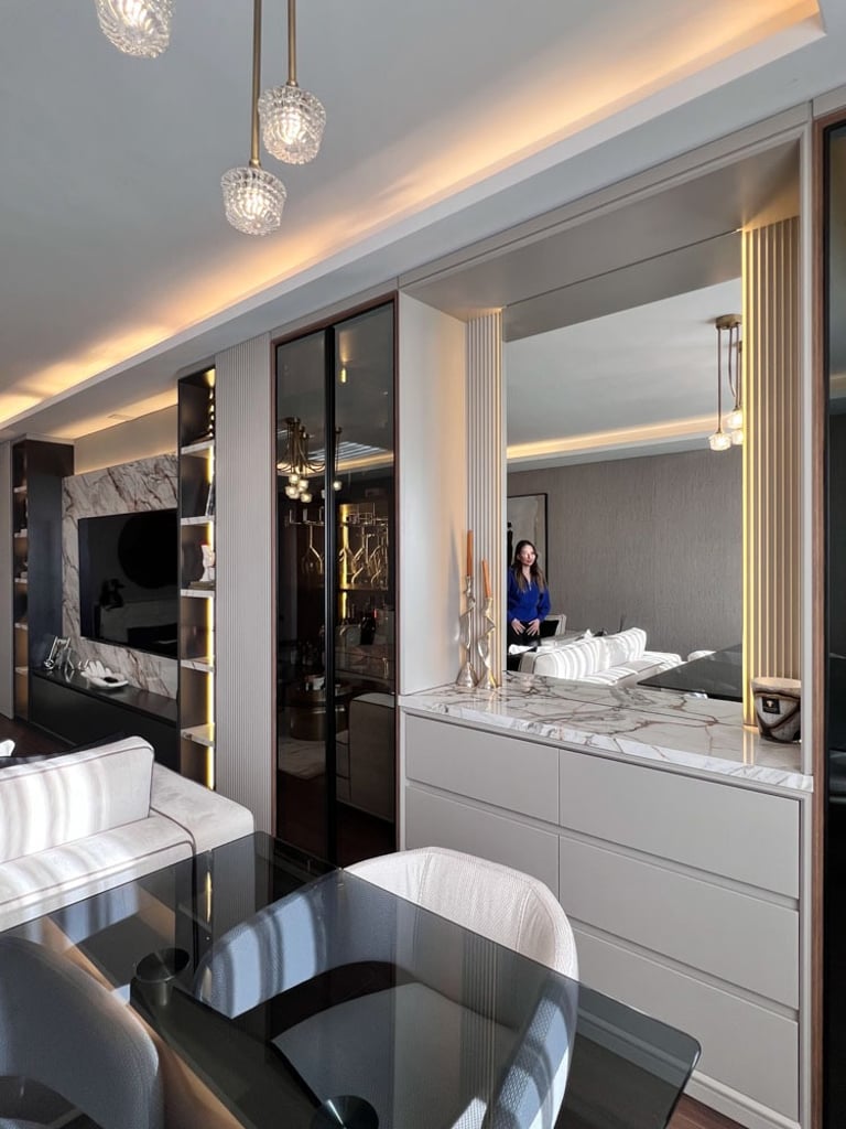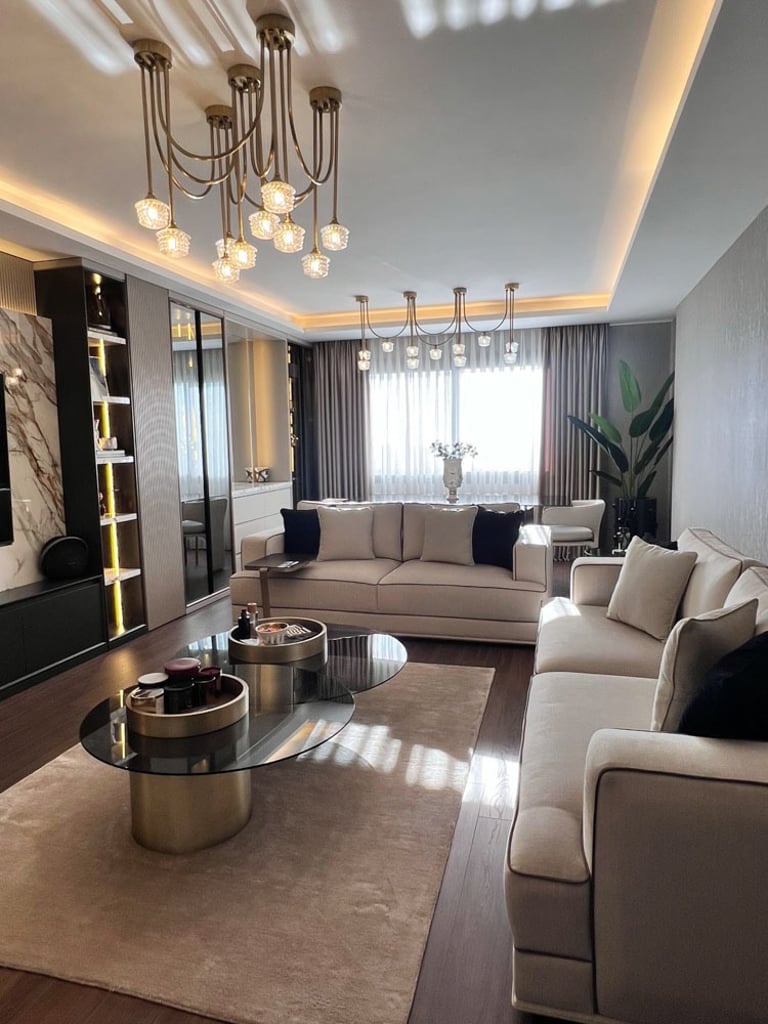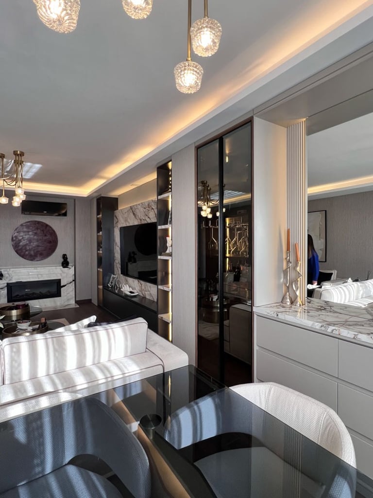 Genç ve Dinamik Bir Yaşam Alanı. Diamondand Rezidans'ta bulunan bu konut, yeni evli genç bir çiftin modern ve şık zevklerine hitap eden özel bir iç mimarlık projesidir. Salonun ana odak noktası, 7.5 metrelik duvarı boyunca uzanan geniş TV ünitesi ve onu devam ettiren özel büfe tasarımıyla bütünleşen yemek alanı oldu. Bu sayede, hem görsel bir süreklilik sağlandı hem de fonksiyonellik en üst düzeye çıkarıldı.