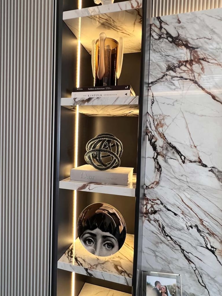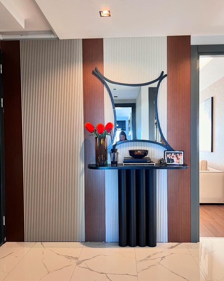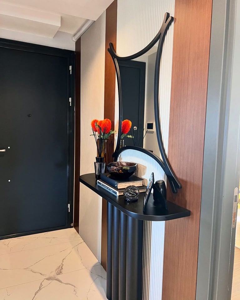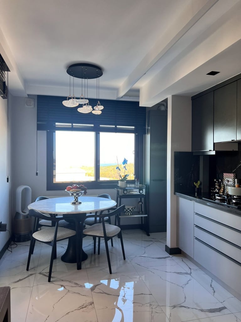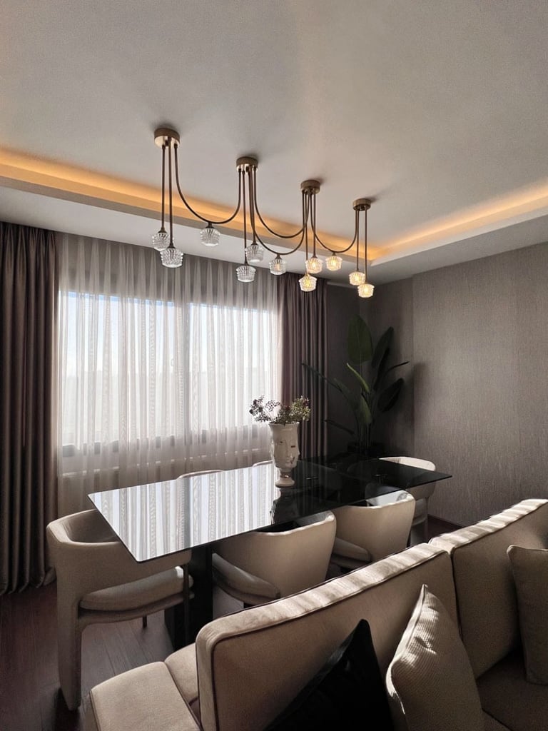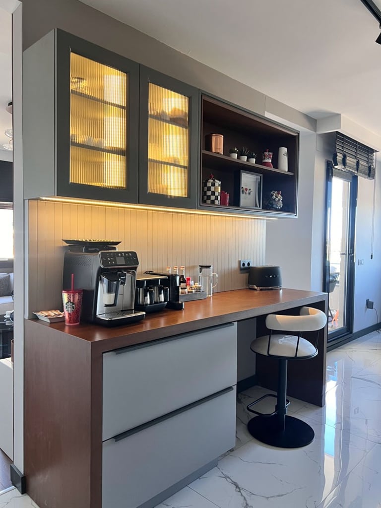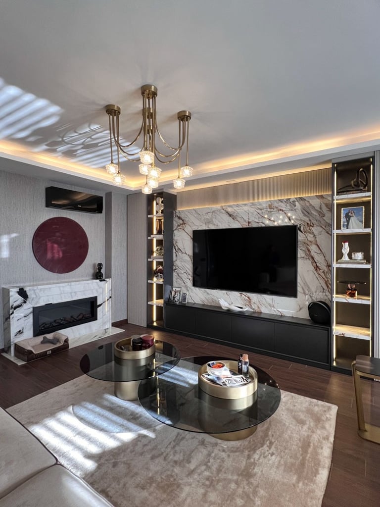 Genç ve Dinamik Bir Yaşam Alanı. Diamondand Rezidans'ta bulunan bu konut, yeni evli genç bir çiftin modern ve şık zevklerine hitap eden özel bir iç mimarlık projesidir. Salonun ana odak noktası, 7.5 metrelik duvarı boyunca uzanan geniş TV ünitesi ve onu devam ettiren özel büfe tasarımıyla bütünleşen yemek alanı oldu. Bu sayede, hem görsel bir süreklilik sağlandı hem de fonksiyonellik en üst düzeye çıkarıldı.