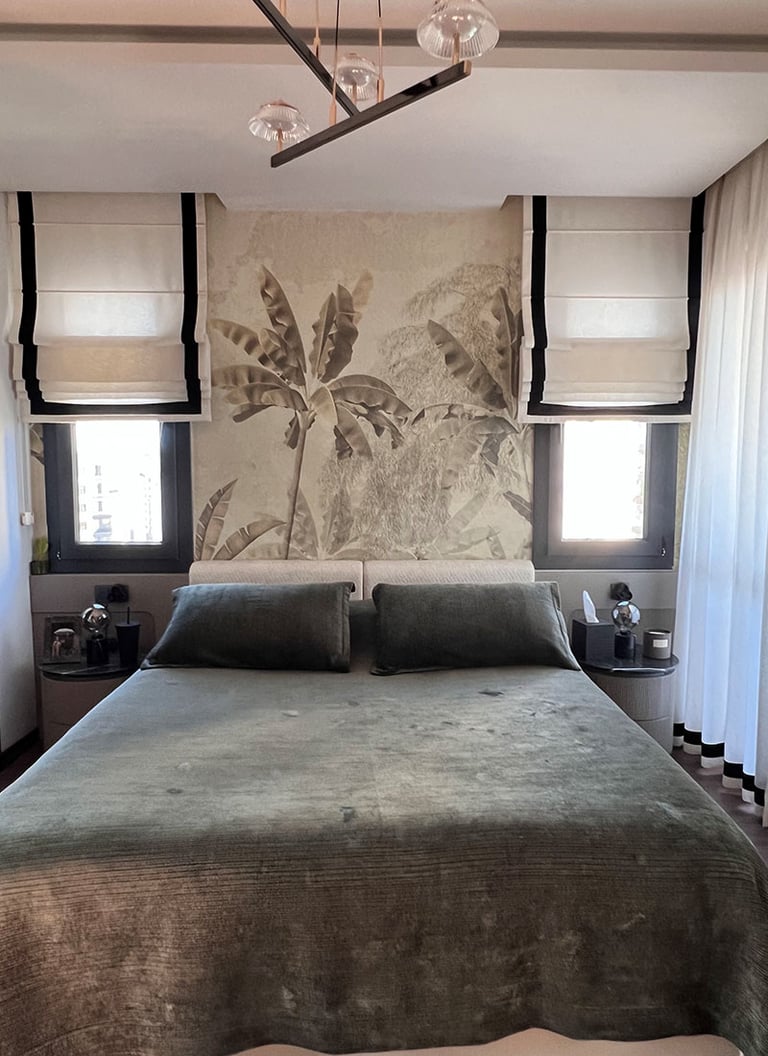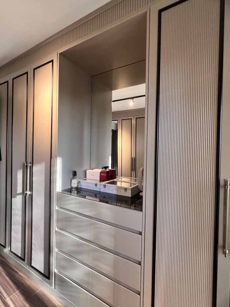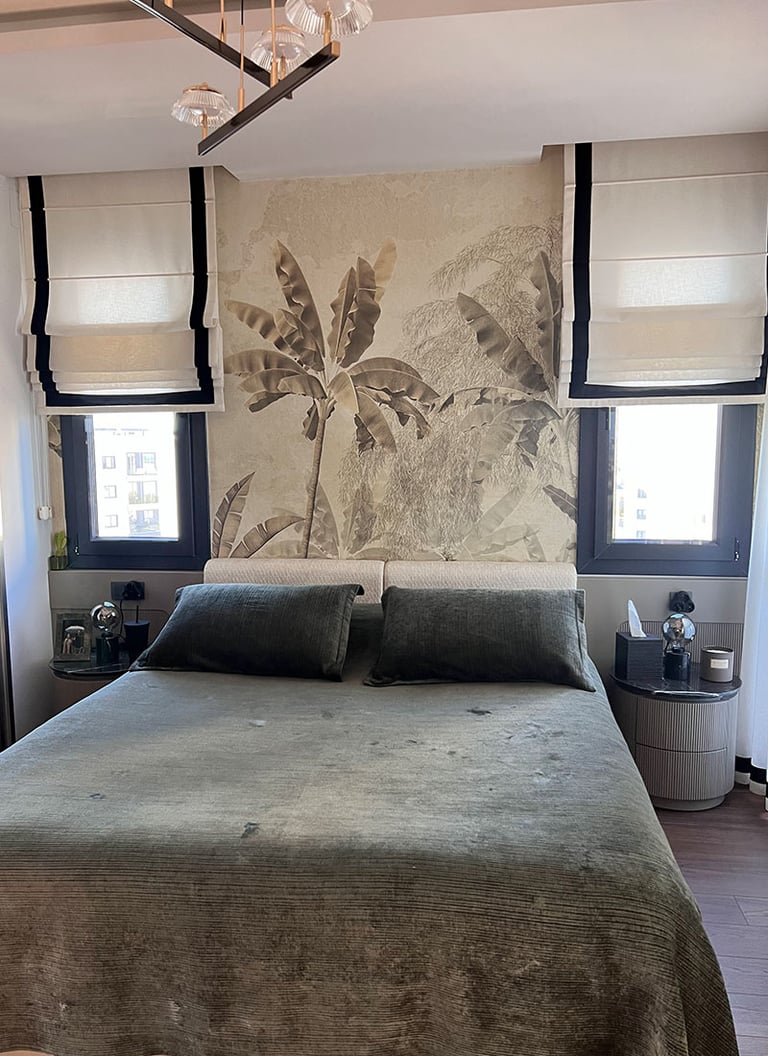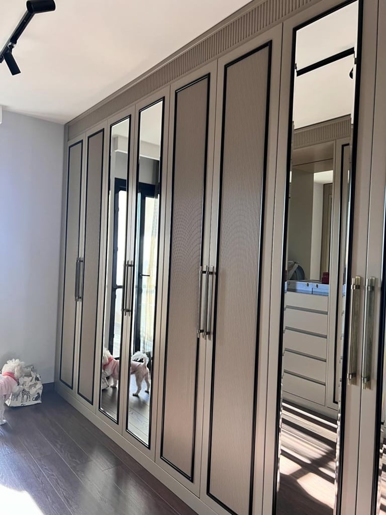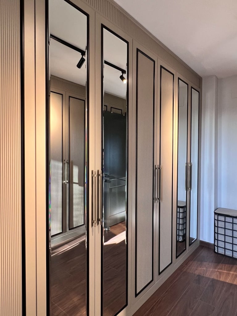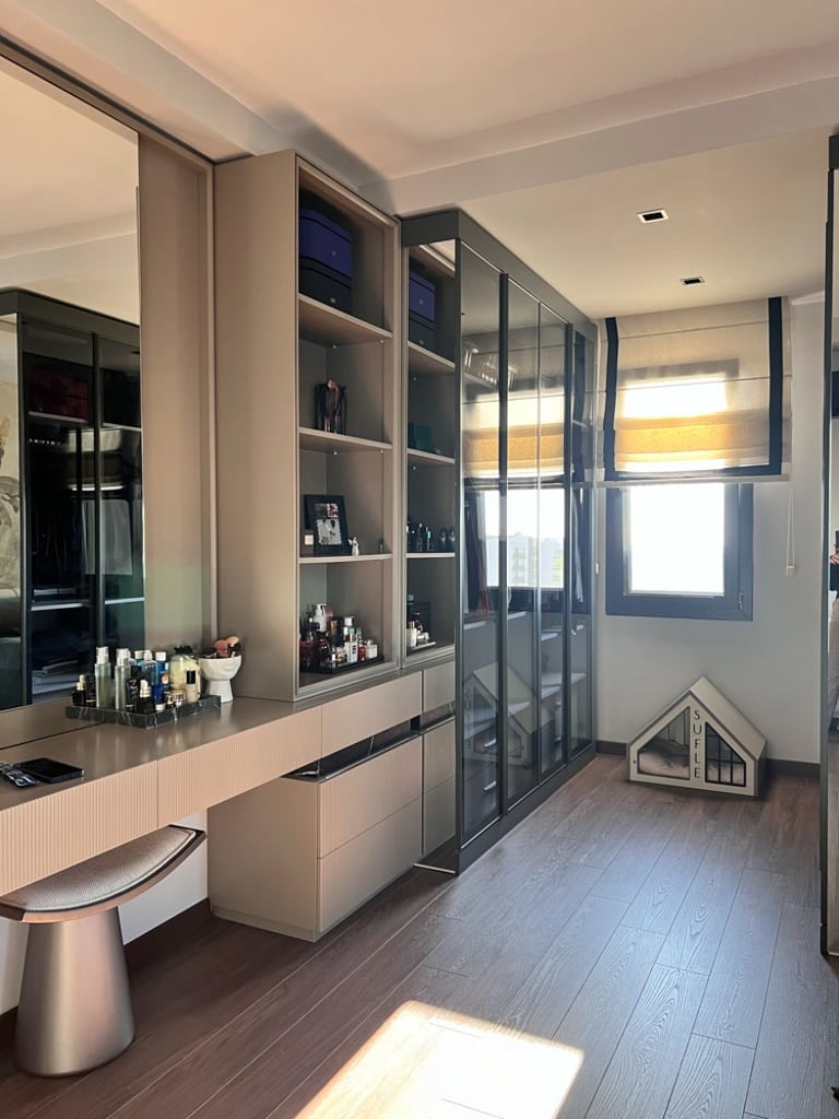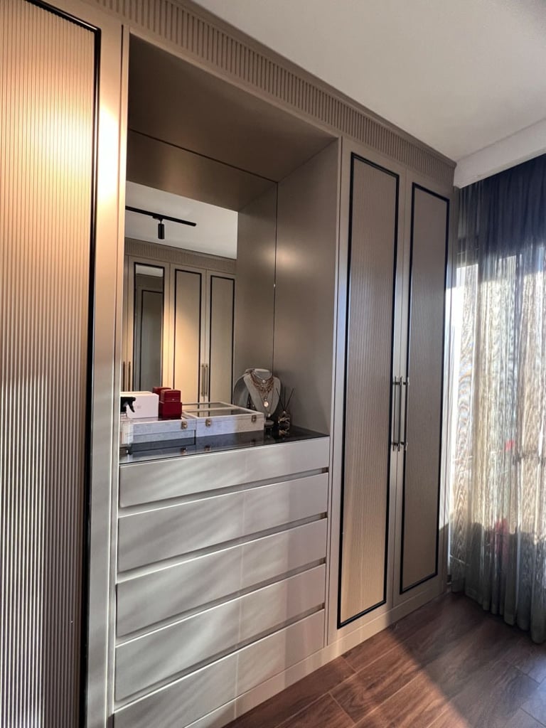 Antre, siyah rengin zarafetiyle vurgulanırken, arkasındaki duvar tasarımı mekana derinlik kattı. Mutfakta mevcut alana eklenen geniş kiler ve kahve köşesi, çiftin günlük yaşamını kolaylaştıran pratik çözümler sunuyor. Yatak odasında, dar pencere aralığına rağmen özel tasarım baza ve başlıklarla alan en verimli şekilde kullanıldı; oval komodinler ve şık bir makyaj alanı ise bu mekana kişisel bir dokunuş katıyor. Ayrıca bir odayı tamamen gardırop odasına dönüştürerek, saklama alanını maksimize eden özel dolaplar tasarlandı ve uygulandı. Türkmen Evi, her detayıyla genç ve modern bir yaşam tarzını yansıtan, konforlu ve estetik bir sığınak sunuyor.