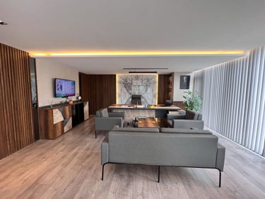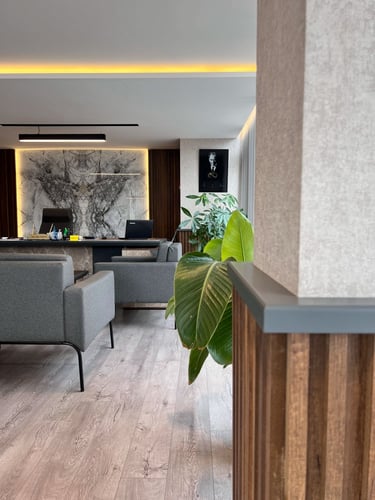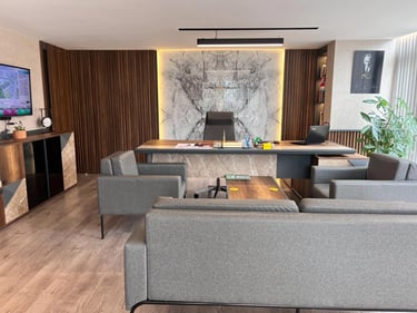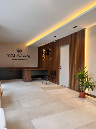 İşlevselliğin ve Şeffaflığın Buluştuğu Adres. Uygulamasını tamamladığımız Yalman İnşaat Ofisi, harita ve emlak işlerinin verimli bir şekilde yürütülebilmesi için modern ve fonksiyonel bir yaklaşımla tasarlandı. Girişteki geniş ve davetkâr bekleme alanı, misafirleri karşılarken, cam bölmelerle ayrılan çalışma odaları, hem şeffaflık hem de ferahlık sağlıyor. Bu sayede çalışanlar, ayrık odalarında olmalarına rağmen ortak bir atmosferin parçası oluyor.Projede, konforlu ve geniş bir yönetici odası ile dinamik toplantılara ev sahipliği yapan bir toplantı alanı yer alıyor. Mutfak alanının ayrı bir hol ile ana ofisten ayrılması ise, hem hijyen hem de sessizlik açısından büyük bir kolaylık sunuyor. Yalman İnşaat Ofisi, hem çalışanların hem de misafirlerin rahatını ve verimliliğini düşünen, akılcı ve şık bir çalışma ortamı sunuyor.